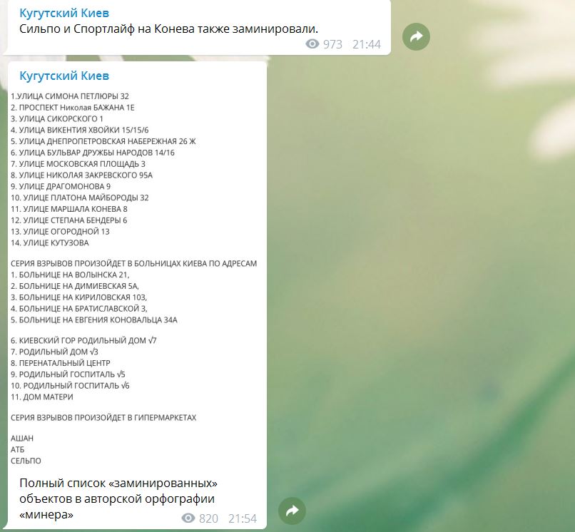 Користувачі в соцмережах повідомляють, що в Києві замінували серію об'єктів, серед яких великі лікарні, пологовий будинок, перинатальний центр, будинки матері і просто житлові будинки.