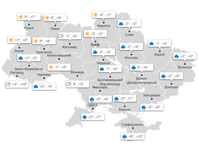 У центральних областях сьогодні хмарно, без опадів. Температура повітря вдень +3...+5.