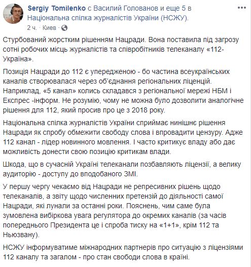 "Стурбований жорстким рішенням Нацради. Вона поставила під загрозу сотні робочих місць журналістів і співробітників телеканалу "112 Україна",- пише Томіленко у своєму повідомленні у соцмережі.