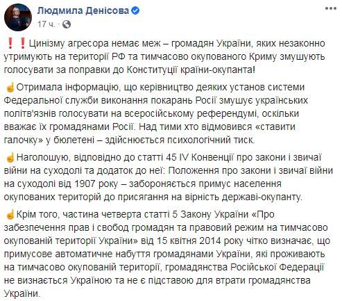 На ситуацію звернула увагу омбудсменка Людмила Денісова, про що зробила публікацію у Facebook в четвер, 2 липня. Омбудсменка заявила, що володіє інформацією про те, що "керівництво деяких установ системи Федеральної служби виконання покарань Росії змушує українських політв'язнів голосувати на всеросійському референдумі, оскільки вважає їх громадянами Росії".
