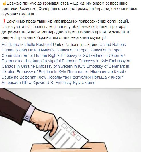 "Над тими, хто відмовився "ставити галочку" у бюлетені - здійснюється психологічний тиск. Підкреслюю, згідно зі статтею 45 IV Конвенції про закони і звичаї війни на суші і додатку до неї: Положення про закони і звичаї війни на суші від 1907 року - забороняється примус населення окупованих територій до присяги на вірність державі-окупанту", - заявила Денісова.