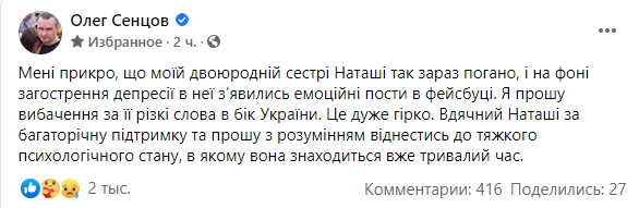 Режисер і колишній політв'язень Путіна Олег Сенцов заявив, що у його двоюрідної сестри загострення депресії. Сенцов написав на своїй сторінці в Facebook, що у Каплан на фоні загострення депресії з’явились емоційні пости у фейсбуці. Сенцов попросив вибачення за її різкі слова в бік України. Сенцов написав, що вдячний Наталі за багаторічну підтримку та попросив з розумінням віднестись до тяжкого психологічного стану, в якому вона знаходиться вже тривалий час.
