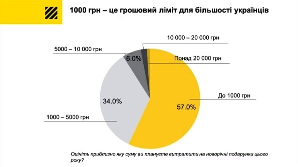 За результатами рекламного агентства Postmen, в якому взяли участь 1700 громадян України, більшість українців не планують збільшувати власний бюджет на купівлю новорічних подарунків. Близько 57% опитаних заявили, що витратять на них менше однієї тисячі гривень, в той же час, близько 20% взагалі не мають наміру купувати щось для інших на свята.