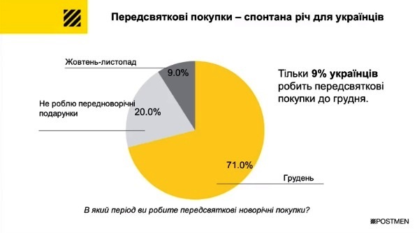 Крім того, 71% опитаних повідомили, що робитимуть покупки "під ялинку" у грудні, 9% придбали їх заздалегідь. Українці віком від 26 до 45 років готові витратити на подарунки більше, ніж молодші та старші люди.