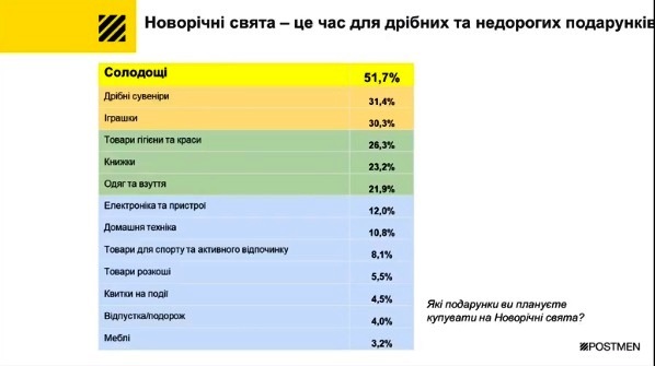 Найбільш схильні до офлайн закупівель респонденти у віці 46-65 років, з них 37% купують речі лише офлайн. На запитання, які саме подарунки українці купуватимуть на свята, більше половини (51.7%) назвали солодощі. В той же час, 31,4% опитаних купуватимуть дрібні сувеніри, а 30,3% – іграшки. Також 23,2% планують дарувати книги, а 4% – подорожі.