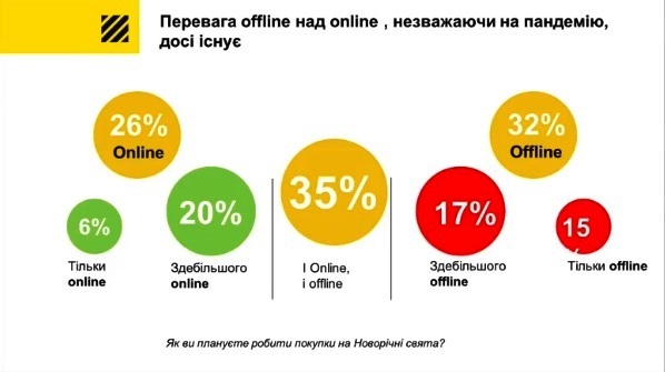 Близько 35% опитаних заявили, що купуватимуть речі і онлайн, і офлайн. Варто зазначити, що більшість респондентів (32%) планують закупатися у магазинах та супермаркетах, онлайн-покупки до свят готові здійснювати 26%.