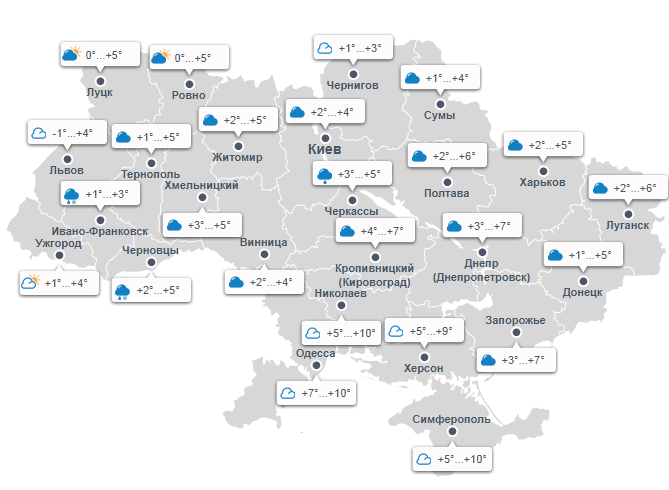 У центральних областях похмуро, локально пройдуть дощі. Температура вдень +5...+7.