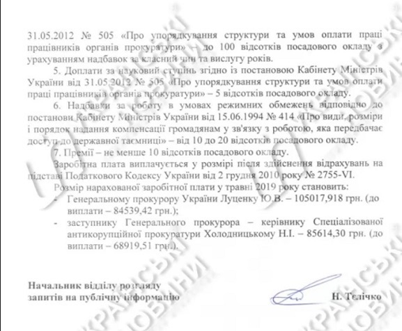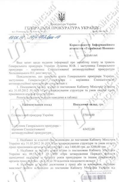 При цьому оклад Юрія Луценка склав 37 000 гривень, а вся зарплата вказана з урахуванням премії, надбавок, а також доплати за високі досягнення та виконання особливо важливої роботи.