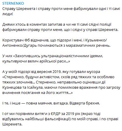 Активіст повідомив, що користувачі мережі звернули увагу на те, що підозри Стерненку і фігурантам справи Шеремета (Яні Дугарь, Андрію Антоненку та Юлії Кузьменко) "починаються з маразматичних пропозицій". А саме: "Захопившись ультранаціоналістичними ідеями, культивуючи велич арійської раси...".