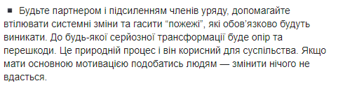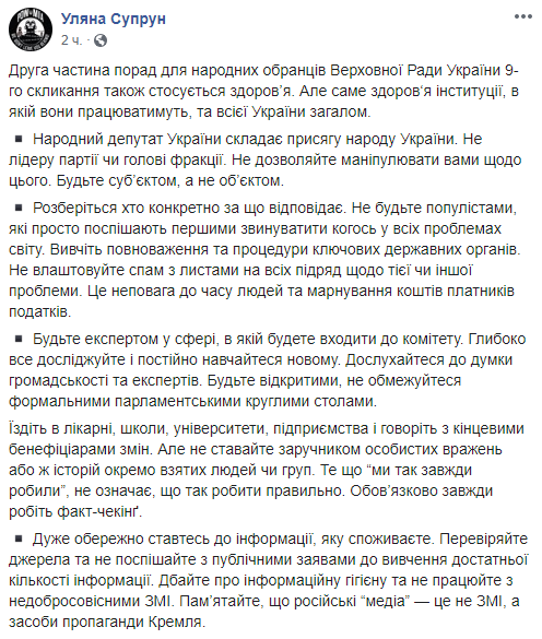 За словами Супрун, друга частина порад для народних обранців також стосується здоров’я, але саме здоров‘я інституції, в якій вони працюватимуть, та всієї України загалом.