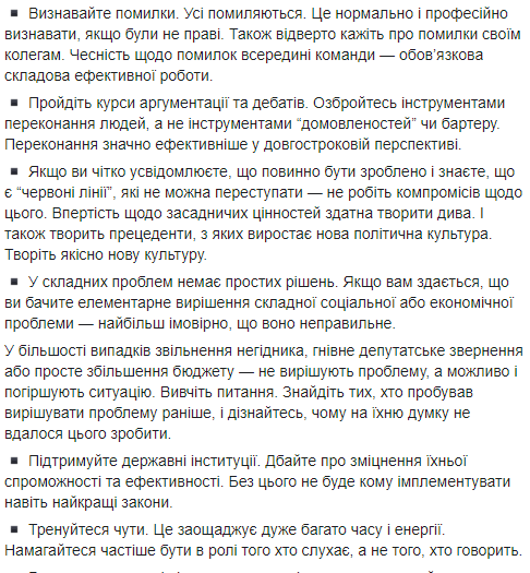Вона також порадила майбутнім нардепам визнавати помилки, пройти курси аргументації та дебатів, підтримувати державні інституції та навчитися чути.