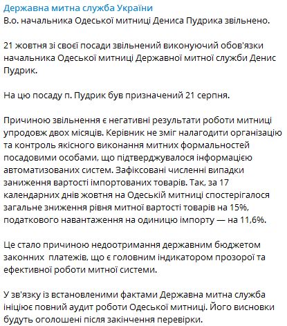 У Державній митній службі України повідомили про звільнення виконувача обов'язки начальника Одеської митниці Дениса Пудрика. Повідомлення про це відомство зробило ввечері в середу, 21 жовтня.