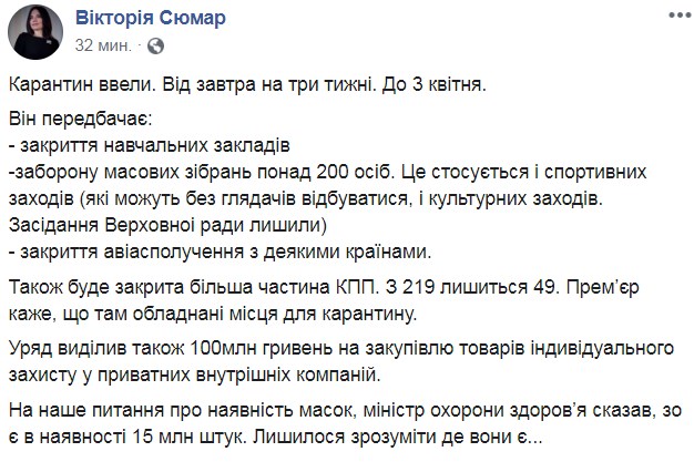 З завтрашнього дня, 12 березня, Україна вводить на своїй території карантин, пов'язаний з поширенням смертельного коронавіруса. Про це на своїй сторінці в Фейсбук повідомляє журналіст Вікторія Сюмар.
