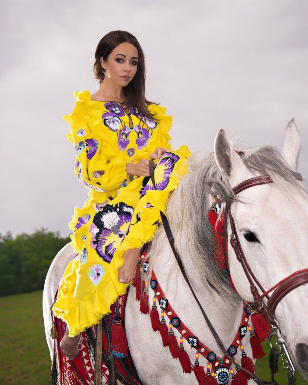 "Притягую теплі промені сонця, надівши вишиванку на якій розташована триколірна фіалка, що є символом весни, оскільки зацвітає одна з перших після танення снігу... Ось вона - елегантність по-українськи, з 3D ефектом від Юлії Магдич! З Днем вишиванки, друзі!".