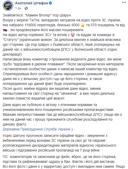 Анатолій Штефан повідомив, що у мережі ТікТок натрапив на відео проти ЗС України, яке набрало 119000 переглядів, близько 5000 лайків та 570 поширень. На відео автор порівнює ЗСУ та воїнів зі свинями та віддає їм команди зі "Статуту" українською мовою. За декілька хвилин Штефан знайшов власника сторінки, ним виявився Ігор Шарун з Львівської області, який є військовослужбовцем ДПСУ у Волинській області згідно декларації. Спочатку Шарун відмовився вибачатися, але після попередження оприлюднити його особисті дані, автор видалив відео, а згодом і сам акаунт.