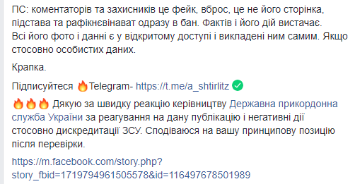 У Держприкордонслужбі повідомили, що засуджують будь-які дії, свідомі чи несвідомі, які робляться проти захисників України. Керівництво відомства відреагувало на пост, що був викладений у Facebook користувачем Анатолієм Штефаном. Негайно здійснено перевірку викладених фактів. Встановлено, що такий військовослужбовець дійсно проходить службу в прикордонному відомстві. Нині призначено службове розслідування.