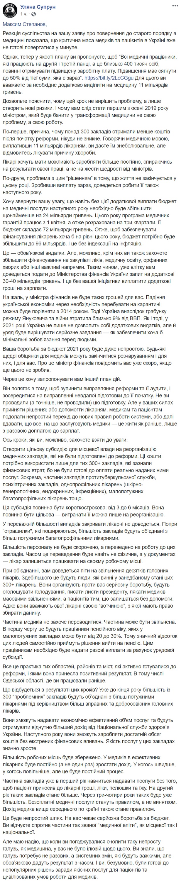 За словами Супрун, дофінансування, виділене головою МОЗ Максимом Степановим 300 лікарням, які виявилися неготовими до медичної реформи, не вирішить проблему, а поглибить її. Лікарі повинні отримати можливість заробляти більше постійно, а не покладатися на щедрість МОЗ. З другого боку, державний бюджет просто не витримає такого тягаря, як фінансування неефективних лікарень, і медики тільки розчаруються.