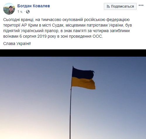 "Сьогодні вранці, на тимчасово окупованій Російською Федерацією території АР Крим в місті Судак, місцевими патріотами України, був піднятий український прапор, в знак пам‘яті за чотирма загиблими воїнами 6 серпня 2019 року в зоні проведення ООС", - повідомив він.