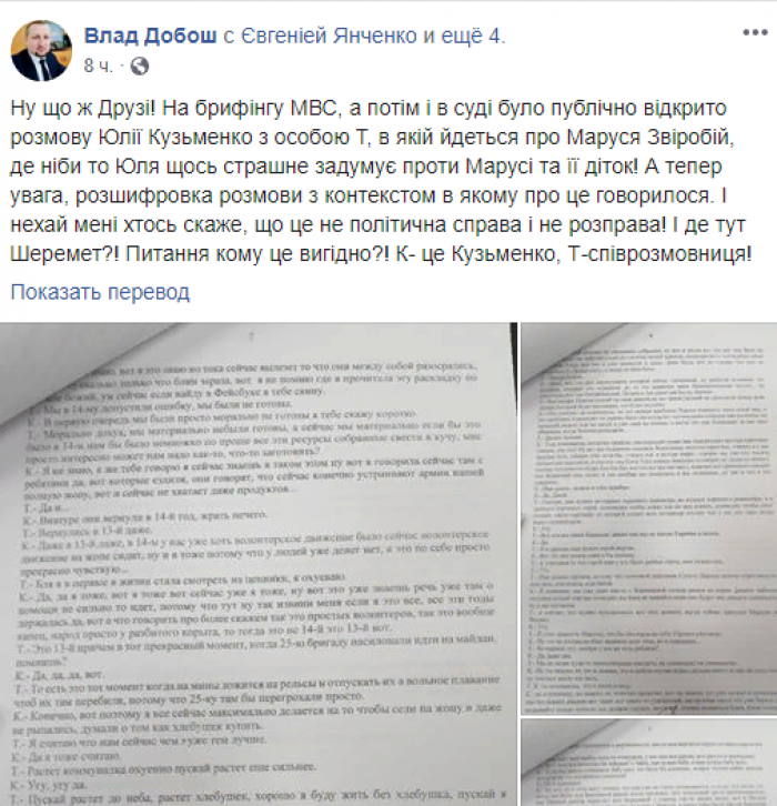 "Ну що ж Друзі! На брифінгу МВС, а потім і в суді було публічно відкрито розмову Юлії Кузьменко з особою Т, в якій йдеться про Маруся Звіробій, де ніби то Юля щось страшне задумує проти Марусі та її діток! А тепер увага, розшифровка розмови з контекстом в якому про це говорилося. І нехай мені хтось скаже, що це не політична справа і не розправа! І де тут Шеремет?! Питання кому це вигідно?! К- це Кузьменко, Т-співрозмовниця", - пише адвокат на своїй сторінці в Facebook 25 грудня.