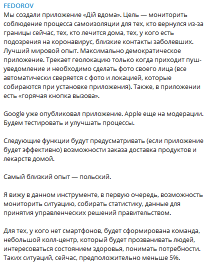 Міністр цифрової трансформації Михайло Федоров також прокоментував у своєму Телеграм-каналі додаток для моніторингу геолокації людей з високим ризиком поширення коронавірусу COVID-19. Як повідомив Федоров, додаток проходить тестування, проте вже є для операційної системи Android.