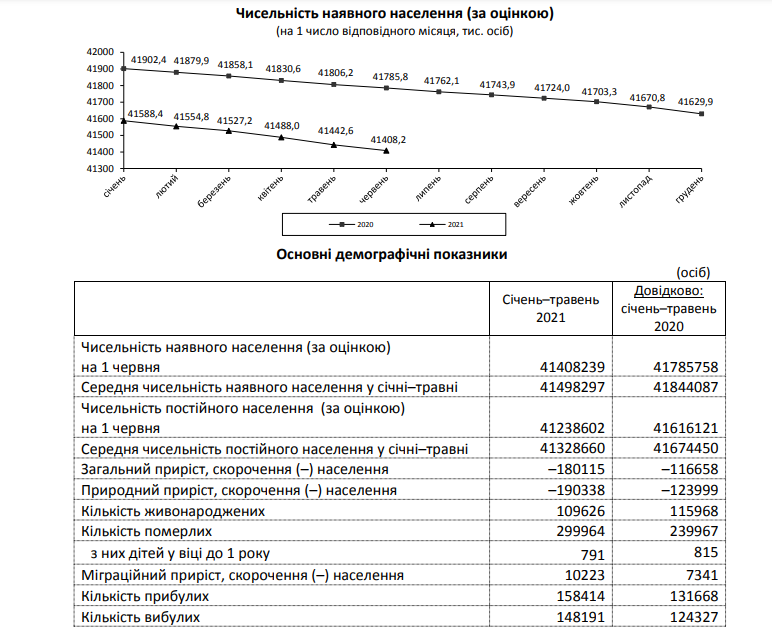 В Україні смертність населення перевищила рівень 2020 року. Державна служба статистики оприлюднила дані, згідно із якими з початку року в Україні померло 299 964 осіб, що на 25% більше в порівнянні з 2020 роком. В травні 2021 року померли 57 293 особи, а в травні 2020 року – 44 680 осіб. З початку 2021 року в Україні народилися 109 626 осіб, за аналогічний період минулого року – 115 968. З початку 2021 року в Україні населення скоротилося на 180 115 осіб. За останньою статистикою, чисельність населення в Україні становить 41 408 239 осіб (на 1 червня 2021).
