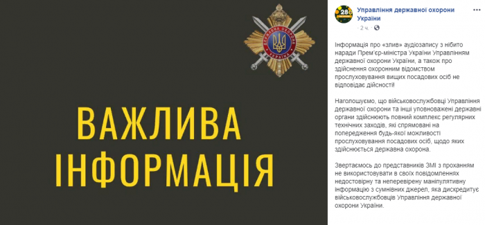 "Інформація про "злив" аудіозаписів з нібито наради прем'єр-міністра Управлінням державної охорони України, а також про здійснення охоронних відомством прослуховування найвищих посадових осіб не відповідає дійсності", – йдеться в повідомленні.