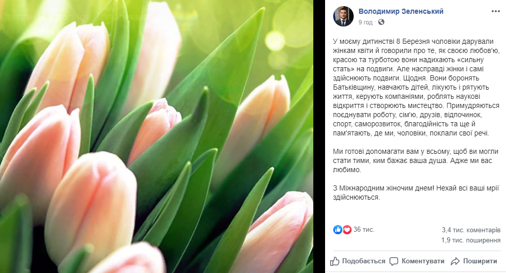 "У моєму дитинстві 8 Березня чоловіки дарували жінкам квіти й говорили про те, як своєю любов'ю, красою та турботою вони надихають «сильну стать» на подвиги. Але насправді жінки і самі здійснюють подвиги. Щодня. Вони боронять Батьківщину, навчають дітей, лікують і рятують життя, керують компаніями, роблять наукові відкриття і створюють мистецтво. Примудряються поєднувати роботу, сім'ю, друзів, відпочинок, спорт, саморозвиток, благодійність та ще й пам'ятають, де ми, чоловіки, поклали свої речі.Ми готові допомагати вам у всьому, щоб ви могли стати тими, ким бажає ваша душа. Адже ми вас любимо.З Міжнародним жіночим днем! Нехай всі ваші мрії здійснюються", - привітав Зеленський жіночу половину України.