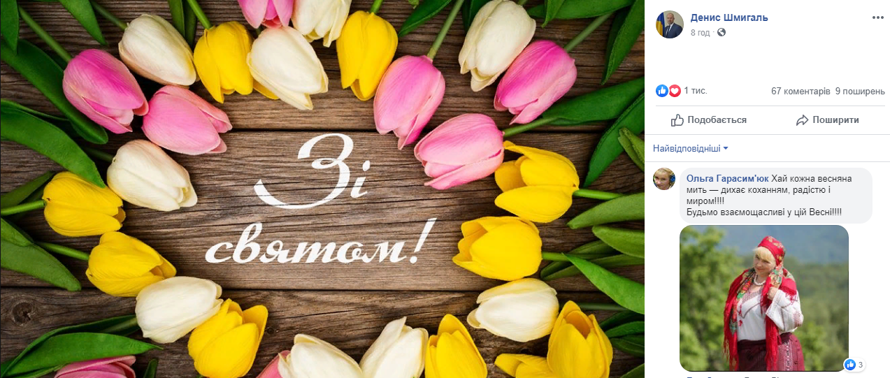 Прем'єр-міністр України Денис Шмигаль вирішив привітати жінок, опублікувавши просто листівку, на якій в обрамленні тюльпанів було написано: "Зі святом!".