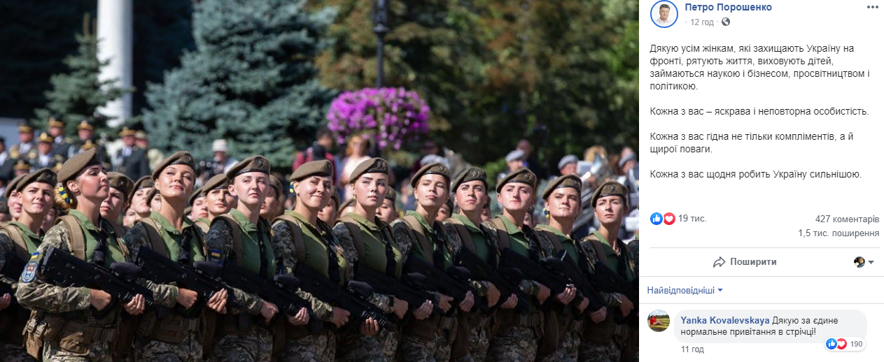 Також про жінок написав у Facebook і п'ятий президент Петро Порошенко. Треба зазначити, що президент не згадував 8 березня, однак нагадав про щоденний подвиг, який виконують жінки на лінії розмежування в зоні проведення операції Об'єднаних сил.