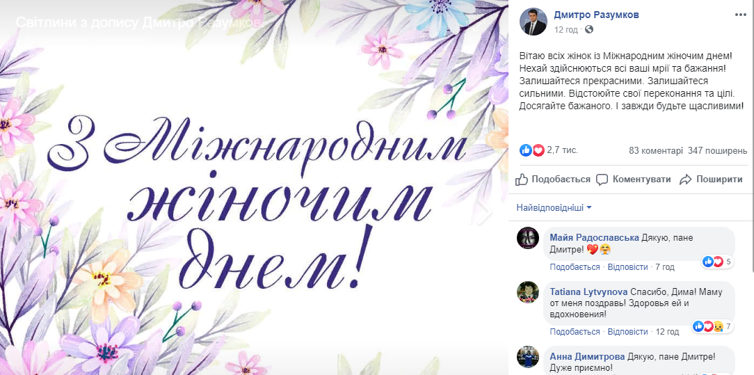 Спікер українського парламенту Дмитро Разумков також опублікував пост у соціальній мережі, присвячений Міжнародному жіночому дню: