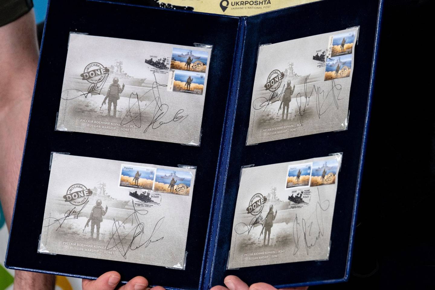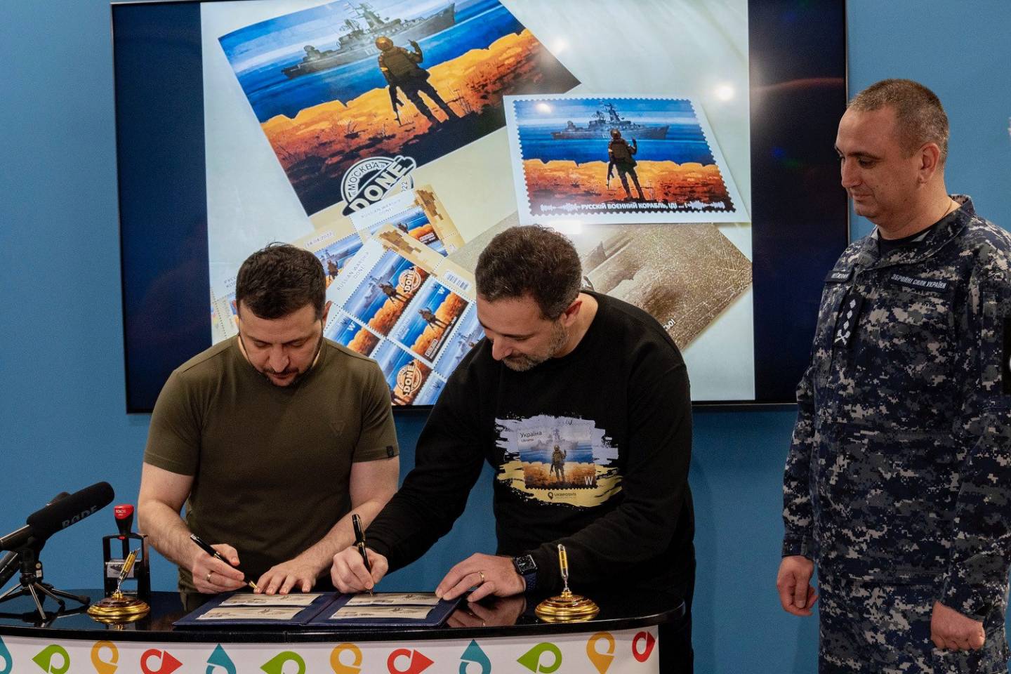 У процедурі також взяли участь командувач ВМС ЗСУ Олексій Неїжпапа та гендиректор "Укрпошти" Ігор Смілянський. Усі троє підписали чотири конверти. Комплекти з конвертів та марок будуть виставлені на аукціоні для збору коштів для ЗСУ.