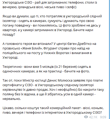 Ужгородський СІЗО - рай для затриманих: телефони, столи із вечерею, ірландське віскі, чеське пиво і селфі. Про це написав у своєму Телеграм-каналі журналіст Віталій Глагола. "Якщо ви думали, що ті, хто потрапляє в ужгородський слідчий ізолятор - сидять в камерах, сумують і думають про свою погану поведінку - ви помилялись. Ці фото зроблені не десь у квартирі, а у камері затриманих в Ужгороді", написав Глагола. На фото, які він оприлюднив, у центрі Євген Дребітко на прізвисько "Женя Білий". Він - фігурант справи про наїзд на поліцейського на посту у Нижніх Воротах. За словами Глаголи, затримані вже 5 місяців (із 21 березня) сидять в одиночних камерах, а як на практиці – можна побачити на фото.