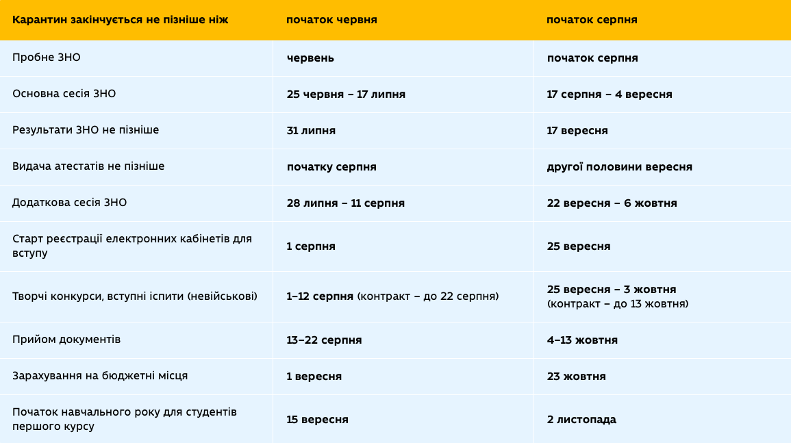 Коли випускники здаватимуть ЗНО, залежить від дати завершення карантину. На сайті МОН наразі оприлюднили два варіанти. Якщо карантин завершиться не пізніше початку червня, основна сесія ЗНО припадатиме на 25 червня-17 липня, якщо ж не пізніше початку серпня – на 17 серпня-4 вересня.
