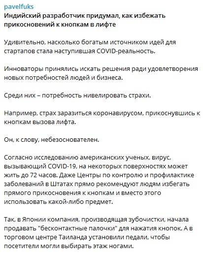 Відомий український бізнесмен і меценат Павло Фукс продовжує розповідати в своєму Телеграм-каналі про інноваторів, які пристосувалися до COVID-реальності і знаходять успішні рішення заради задоволення нових потреб людей і бізнесу.