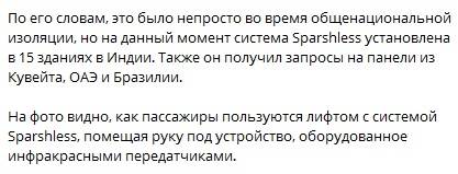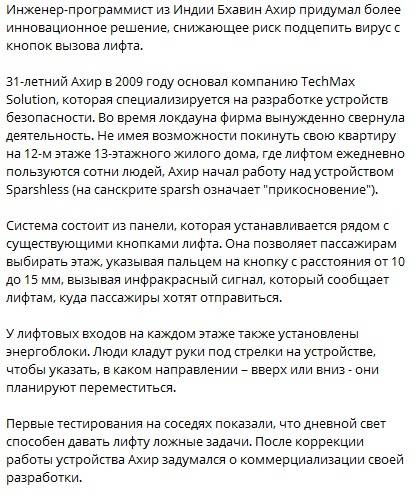Згідно з дослідженням американських вчених, вірус, що викликає COVID-19, на деяких поверхнях може жити до 72 годин. Інженер-програміст з Індії Бхавін Ахір придумав більш інноваційне рішення, що знижує ризик підчепити вірус з кнопок виклику ліфта. Засновник компанії TechMax Solution, яка спеціалізується на розробці пристроїв безпеки, згорнув діяльність фірми під час локдауна. Ахір почав роботу над пристроєм Sparshless (на санскриті sparsh означає "дотик"). Система складається з панелі, яка встановлюється поруч з існуючими кнопками ліфта. Вона дозволяє пасажирам вибирати поверх, вказуючи пальцем на кнопку з відстані від 10 до 15 мм, викликаючи інфрачервоний сигнал, який повідомляє ліфтам, куди пасажири хочуть відправитися. У ліфтових входів на кожному поверсі також встановлені енергоблоки. Люди кладуть руки під стрілки на пристрої, щоб вказати, в якому напрямку - вгору чи вниз - вони планують переміститися.
