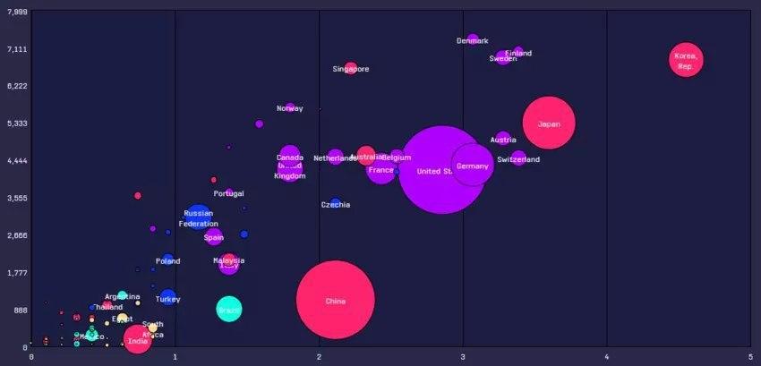Павло Фукс зазначає, що в Україні стоїть проблема не тільки якості інновацій, а й фінансування науково-дослідних робіт. На графіку Статистичного інституту ЮНЕСКО в правому верхньому куті показані країни, які більше за інших витрачають на R&D (% від ВВП) і мають більшу кількість дослідників на мільйон жителів. Україна в ньому в лівому нижньому кутку.