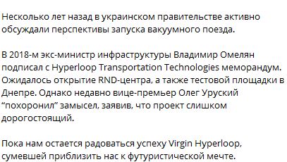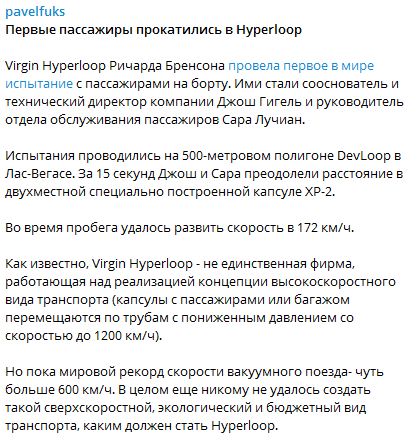"Як відомо, Virgin Hyperloop - не єдина фірма, що працює над реалізацією Концепції високошвидкісного виду транспорту (капсули з пасажирами або багажем переміщаються по трубах зі зниженим тиском зі швидкістю до 1200 км/год). Але поки світовий рекорд швидкості вакуумного поїзда — трохи понад 600 км / год в цілому ще нікому не вдалося створити такий надшвидкісний, екологічний і бюджетний вид транспорту, яким повинен стати Hyperloop", - пише бізнесмен.