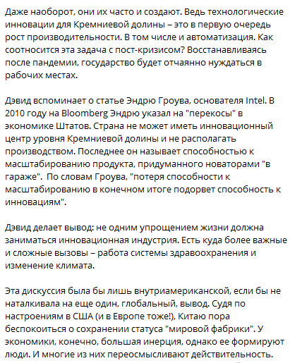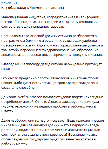 За словами Павла Фукса, це навіть визнає головний редактор MIT Technology Девід Ротман, який зазначає, що нині технологія нічого не будує, адже вакцин або діагностичних центрів Кремнієва долина створити не здатна. Більш того, технологи не тільки не вирішують проблеми робочих місць у Штатах, вони їх часто і створюють. Оскільки технологічні інновації для Кремнієвої долини - це зростання продуктивності і автоматизація. Як співвідноситься ця задача з пост-кризою? А США після пандемії буде відчайдушно потребувати робочих місцях.