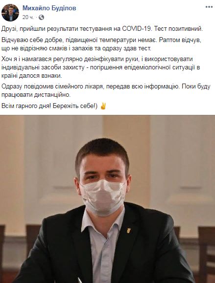 "Хоч я і намагався регулярно дезінфікувати руки і використовувати індивідуальні засоби захисту - погіршення епідеміологічної ситуації в країні позначилося. Відразу повідомив сімейного лікаря, передав всю інформацію. Поки буду працювати дистанційно", - повідомив Буділов, закликавши українців берегти себе.