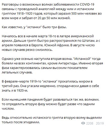 "Ту ж оцінку можна застосувати до інших країн, які пережили "відродження" захворювання. Розмови про можливі хвилі захворюваності COVID - 19 пов'язані з проведеною аналогією між ним і іспанським грипом 1918-1920 років, який заразив 500 млн осіб у всьому світі та забрав від 20 до 50 млн життів", - розповів Фукс.