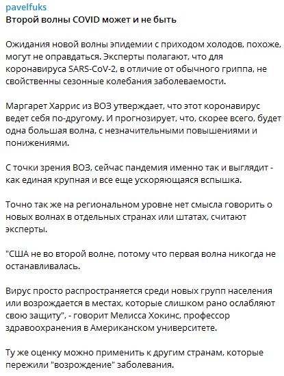 "Очікування нової хвилі епідемії з приходом холодів, схоже, можуть не виправдатися. Експерти вважають, що для коронавірусу SARS-CoV-2, на відміну від звичайного грипу, не властиві сезонні коливання захворюваності. Маргарет Харріс з ВООЗ стверджує, що цей коронавірус поводиться по-іншому. І прогнозує, що, швидше за все, буде одна велика хвиля, з незначними підвищеннями і пониженнями", - повідомив меценат в мережі.
