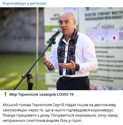 Про це повідомив Телеграм-канал "Коронавірус у регіонах" у вівторок, 1 вересня. Зазначається, що Сергій Надал планує працювати вдома. Крім того, повідомляється, що у мера Тернополя поки немає серйозного нездужання. В цілому він відчуває себе добре. З симптоматики коронавірусу у нього присутній тільки біль в горлі.