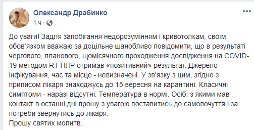 Відомий церковний діяч України, митрополит Переяславський і Вишневський Православної Церкви України Олександр Драбинко захворів на COVID-19. Про це Драбинко написав на своїй сторінці у Facebook. Митрополит повідомив, що після чергового, планового, щомісячного проходження дослідження на COVID-19 методом RT-ПЛР він отримав позитивний результат. Драбинко повідомив, що джерело інфікування, час та місце - невизначені. Згідно з приписом лікаря Драбинко знаходиться до 15 вересня на самоізоляції. За словами митрополита, класичні симптоми хвороби у нього наразі відсутні. Температура у нормі.