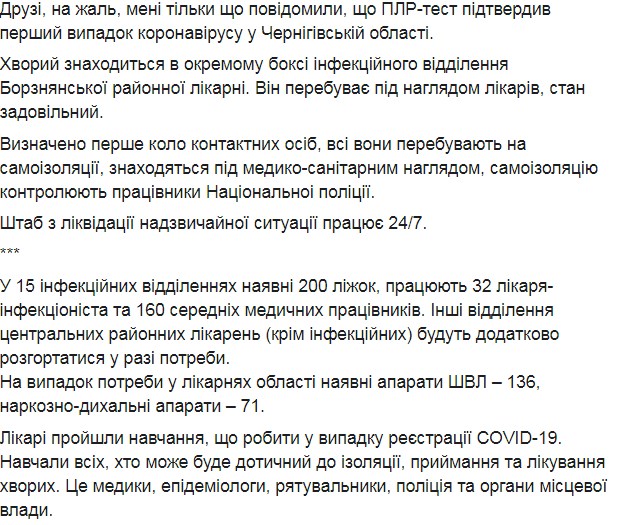 "Хворий знаходиться в окремому боксі інфекційного відділення Борзнянської районної лікарні в задовільному стані", - написав Андрій Прокопенко.