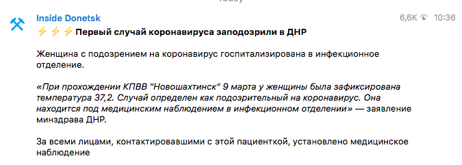 "При проходженні КПВВ "Новошахтинськ" 9 березня у жінки була зафіксована температура 37,2. Випадок визначено як підозрілий на коронавірус. Вона перебуває під медичним наглядом в інфекційному відділенні" - цитує Телеграм-канал заяву так званого "МОЗ ДНР".