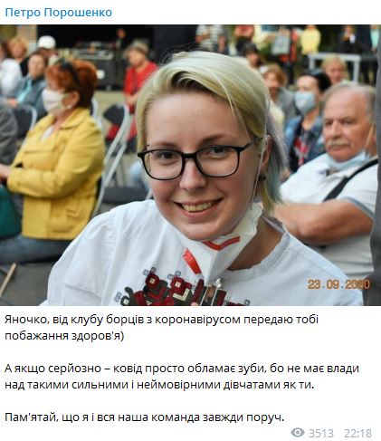 Варто зазначити, що вчора лідер партії "Євросолідарність", п'ятий президент Петро Порошенко через Телеграм-канал підтримав Яну Зінкевич. "Яночка, від клубу борців з коронавірусом передаю тобі побажання здоров'я. А якщо серйозно - ковід просто обламає зуби, тому що не має влади над такими сильними і неймовірними дівчатами як ти. Пам'ятай, що я і вся наша команда завжди поруч", - написав Порошенко.