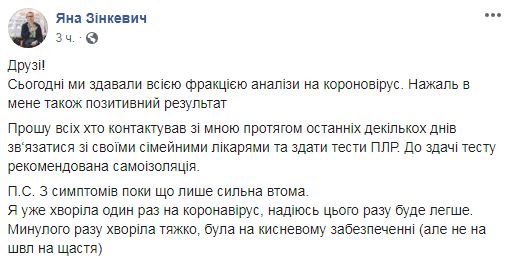 Про це Яна Зінкевич розповіла у себе на сторінці у Facebook в середу, 30 вересня. З симптоматики у неї зараз спостерігається лише сильна втома. Нардепка також повідомила, що її лікуванням на сьогодні є вживання якомога більше рідини і сон. Також вона зазначила, що світові потрібна вакцина від коронавірусу, яка істотно знизить смертність від цього підступного захворювання.