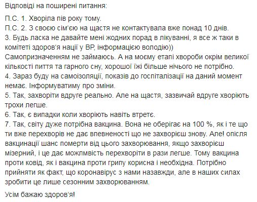 "Сьогодні ми здавали усією фракцією аналізи на коронавірус. На жаль, у мене такожю Так, світу дуже потрібна вакцина. Вона не оберігає на 100%, як і те, що ти вже перехворів - не дає впевненості, що не захворієш знову. Але! Після вакцинації шанс померти від цього захворювання, якщо захворієш, малий, і це дає можливість перехворіти в рази легше. Тому вакцина проти ковіда, як і вакцина проти грипу, корисна і необхідна. Потрібно прийняти як факт, що коронавірус з нами назавжди, але в наших силах зробити це лише сезонним захворюванням".