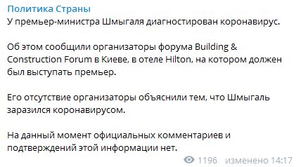 Так, сьогодні, 29 жовтня, Телеграм-канал "Політика країни" повідомив, що у прем'єр-міністра діагностовано коронавірус. Повідомляється, що сьогодні голова уряду повинен був виступати на форумі Building & Construction Forum у Києві.