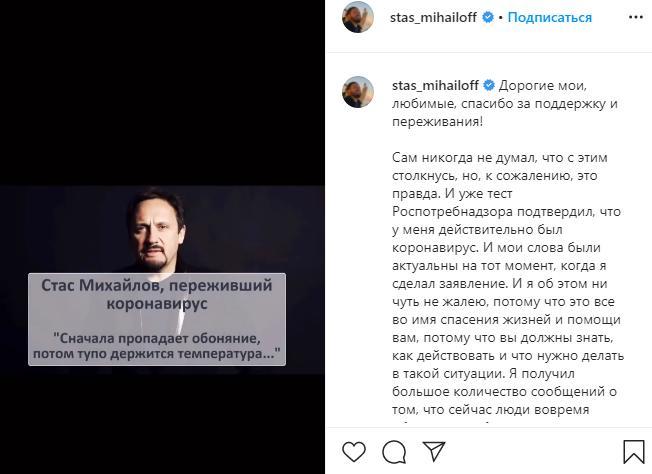 Також Михайлов закликав дотримуватися карантину, самоізолюватися і перечекати епідемію вдома. Співак підкреслив, що сьогодні не обходимо проявляти повагу як до себе, так і до оточення, не піддаючи їх непотрібному ризику. Про все про це перець розповів на своїй сторінці в Instsgram. "Сам ніколи не думав, що з цим зіткнуся, але, на жаль, це правда. І вже тест Росспоживнагляду підтвердив, що у мене дійсно був коронавірус",- написав у своїй публікації 12 квітня Стас Михайлов.